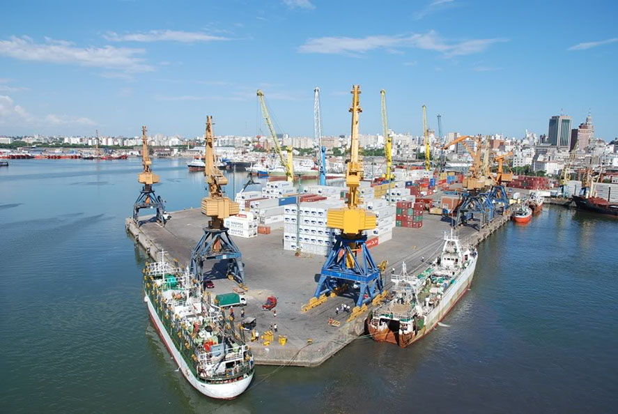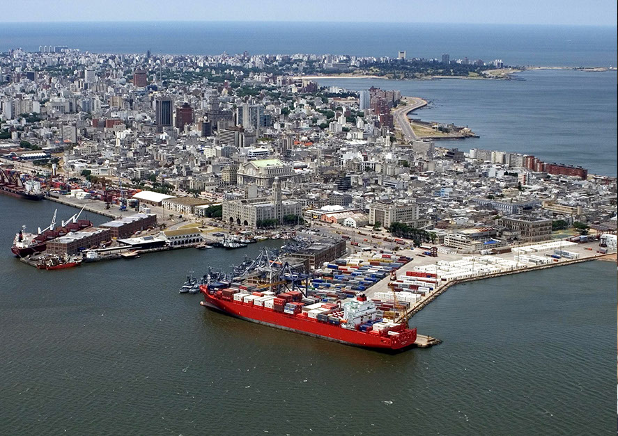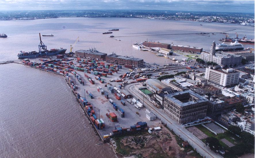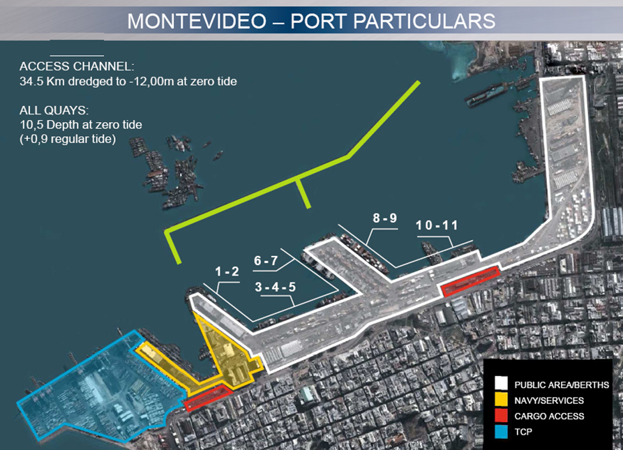 The port of Montevideo is located on the River Plate mouth, left margin, and is the port of the capital city of the República Oriental del Uruguay. The port has been built inside of a bay that shelters the installation. Basically the port can be divided in two sections: one, on the eastern side of the bay, is dedicated to the dry cargo, containers and passengers vessels; the second one on the northwestern side, called La Teja, is the oil and gas terminal. The Montevideo entrance channel is dredged to 11,50 m at zero datum.